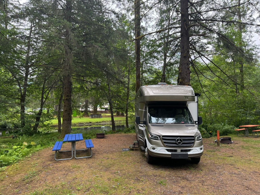 When you wake up after a low power alarm, you tend to rise for the day at an absurdly early hour. Knowing that all we were going to do for hours was sit and obsess that we couldnt turn on our generator, we opted to “set sail” from Boya at 6am. We left the park, found the first rest stop (amazingly about ten minutes away), parked and started up that generator and set up Starlink…. THEN we made coffee and enjoyed our morning routine. We crossed into Yukon and went east to Watson Lake (known for its Signpost Forest where at last count there were 100,000 on display) for both a gasoline and breakfast fill up. And then we began our drive on the Alaska Highway. We stopped at a little RV park called the Continental Divide Lodge and RV. The storefront appearance would normally lead you to keep on driving, but by then we did not care. And as it turned out, it was the right decision. We were one of three rigs there, there as NO lake view, but we had all the hookups. Dale was able to clean the bugs off the front of the vehicle, we were able to really look at the calendar and plan our time in Alaska, played some cribbage, had our first (and likely only) campfire, and slept like babies.
