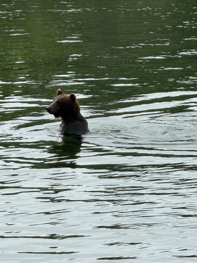 One of the newer parks, established in 1978, it is VAST. If you were a PBS watcher in the old days, you may remember a documentary called Alone in the Wilderness, about Dick Proenneke and the cabin he built and lived in for 30 years on the shores of Twin Lakes. You can visit the cabin, IF you can find a pilot who will fly you. For whatever reason, there are no regular tours to it, so getting there is not a low-budget affair. Now that I know, if we ever come back, that trip will be preplanned! When I finally gave up on that idea I had booked the other way to visit, which was a flight seeing tour for bears. AND THEN the tour was cancelled for bad weather. I was heartbroken, just sure I was going to have to miss another NP. Fortunately however, Dale was really hoping to see bears, and thinking we’d find them on the peninsula. A little sleuthing uncovered the hard truth, if they were that easy to see on the peninsula proper, then flight seeing tours would not be so popular! So, I was able to find us a boat tour over to the park to commune with bears. The weather had finally cooperated and we had a glorious couple days ahead of us! The mountain ranges were in full visibility for our boat ride over. And while our guide was very conservative about roaming the shore to get better proximity, we did get some good sightings of the bears, so in the end Dale DID get to see bears in the Kenai and I got to set foot in Lake Clark National Park…….and another stamp…..check!