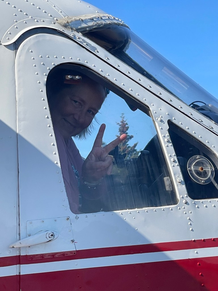 The next day was my tour to Katmai and the day was absolutely beautiful. Mother Nature really played nice that day! Dale had a little scare with a sore tooth, and was more than happy to stay behind and visit a very lovely dentist who made time for him on short notice (he’s ok BTW – no major dental work required.) My plane ride started a short bike ride away from where we are staying, and it was me and a family of 7 on the plane. So I got to be co-pilot. Which was great as he and I chatted the entire way to the park. As it turned out, the entire plane could hear us over the headsets, so they felt they knew me pretty well when we landed. After I graduated from Bear School ( I have the pin to prove it!) I headed out on my own to find some bears. They did not disappoint! Saw my first within five minutes of walking, and it was so uncrowded, I had a good 45 minutes to and hour on the falls viewing platform to watch the few that were there. Mid August is later in the season so while there weren’t a dozen lined up, the ones I watched were entertaining enough. I sang softly to myself as I walked all over the area of the park around the visitor center and lodge where there is that chance you will come across one on the trail, but in the end, I always saw them a few yards away. It is pretty clear that the Katmai bears are very used to people, so as long as you don’t run up and try to take a selfie with one of them, they really aren’t threatened by you. I have had this trip in my brain for sooo long, truly a dream come true. The plane ride in and back was also entertaining, the views from above truly allow you to appreciate how big the wilderness is here in Alaska, and we had the chance to fly over Ten Thousand Smokes, an area of Katmai named due to the volcanic ash from the 1912 eruption in the area. Named not for residual smoke, but because when the wind blows the ash looks like things are still burning! One hundred years later, and only the finest bits of vegetation are visible. I could go on and on. Plus, from the air, the Homer Spit looks VERY vulnerable. Almost had to buy the disaster response instructions for Homer: “In case of Tsunami, Get off the Spit!”. Bottom line, this trip DID NOT DISAPPOINT!