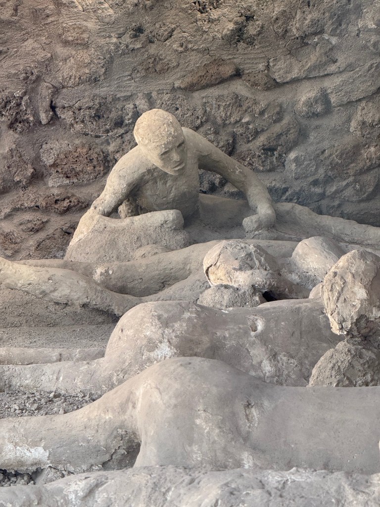 Not knowing what to expect, I went online and bought us entry tickets for the next day. Having walked the evening before and stopping for a less than satisfactory dinner (didn’t know that was possible in Italy!) we found the entrance surprisingly close. Of course, the online tickets I bought said to redeem them at the main entrance, a fifteen minute walk from our apartment. But being the rebels that we are, we went to back gate just after 10 am. A very relaxed start time for us. We seriously can’t say enough about off season travel. We walked right to the gate, they didn’t blink twice at the tickets being redeemable at a different entrance, we rented a couple of audio guides and in We went! The positives: we are visiting during off season so the crowds were very small and the temperatures were perfect! The negatives: many of the homes were not open for touring! Definitely took advantage of the few that were and it is true, it IS much easier to picture Roman life here than in the ruins of Rome. Although we weren’t leaving until we found the body casts, we were hoping we’d see them in the places they fell. Our ignorance I guess. Beyond that, we could listen to descriptions of frescos and rooms within a house, but staring in from the gated front door wasn’t even as interesting as reading a book with pictures of the ruins. So, in conclusion, unless you are visiting during the hot crowded season, Pompeii was worth a half day visit.